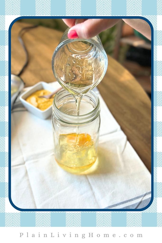 - Carefully insert the stick blender into the jar. Rest the blade just below the surface of the oil. Don't rest it on the bottom of the jar.