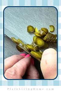 - Next, finely chop your sweet pickle and dill pickle. The size of the chunks is up to you. Consider if your thousand island will be for pouring or dipping. It’s hard to pour large chunks.