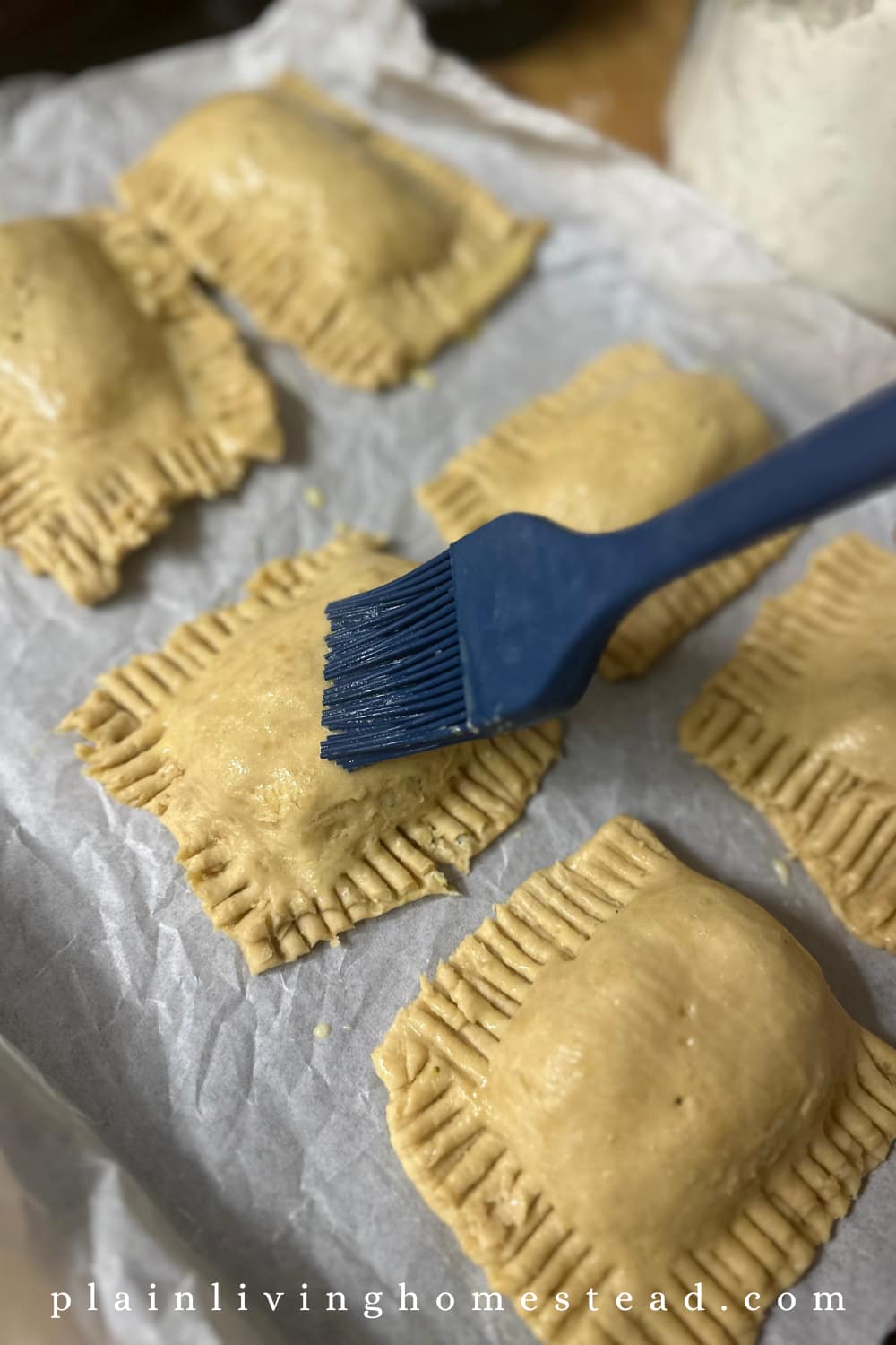 - Spoon filling, brush edges with water, top with second rectangle, crimp.